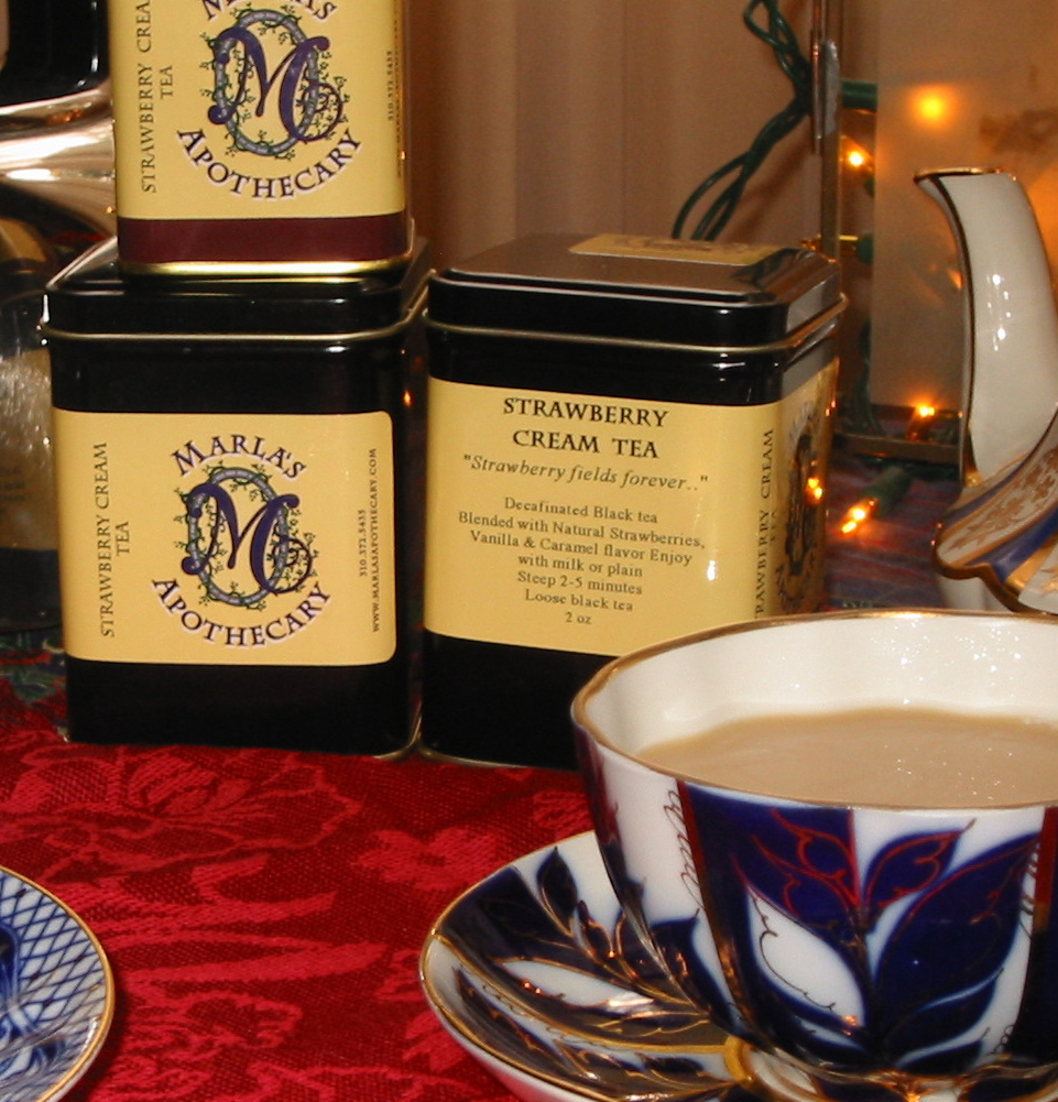 Strawberry Cream tea Purchase here Secure Site This year at last I am delighted to bring you Marla's Apothecary Tea! Those of you who know me know that I love tea. After a very long search through many teas, I have finally found the right combination of natural flavors and superb teas that will allow me to to blend my own signature blends. I have started with one blend for the winter season. I have chosen a traditional black China tea, and, in addition using a superior CO-2 process, a decaffeinated Ceylon from Sri Lanka. This decaffeinated process is natural and gentle, allowing tea leaves to retain their delicate shape and flavor. For the winter season a time that can be frazzling, or dizzying, I wanted to create a tea blend that would bring a sense of calm and warmth, something that would slow time a bit when you sit down with a cup, a tea that could be taken with or without milk and sugar, yet still retain it's character. I used natural flavorings because the artificial synthetics just don't bring the same qualities that I wanted to share. For this first tea blend. I used natural strawberry, not the fruity synthetic sharp kind. Imagine rather the natural luscious, delicious, sensuous, candy liquor of a perfectly ripe, late summer strawberry... To this I add sweet vanilla bean, embracing, with its soft steady resinous warmth. Remember how comforting it smells wrapping you in its soothing arm. Finally I lace the tea slightly with small buttery caramel cream pieces to ground the tea and bring in an earthy tone. Also make sure to check my related links page for other great tea companies and accoutrements. New Peach Cream Tea a Peach and Vanilla over South African Roibois no caffine but plenty of vitamin C. Kids love this too. Wonderful Places for tea coming soon- |